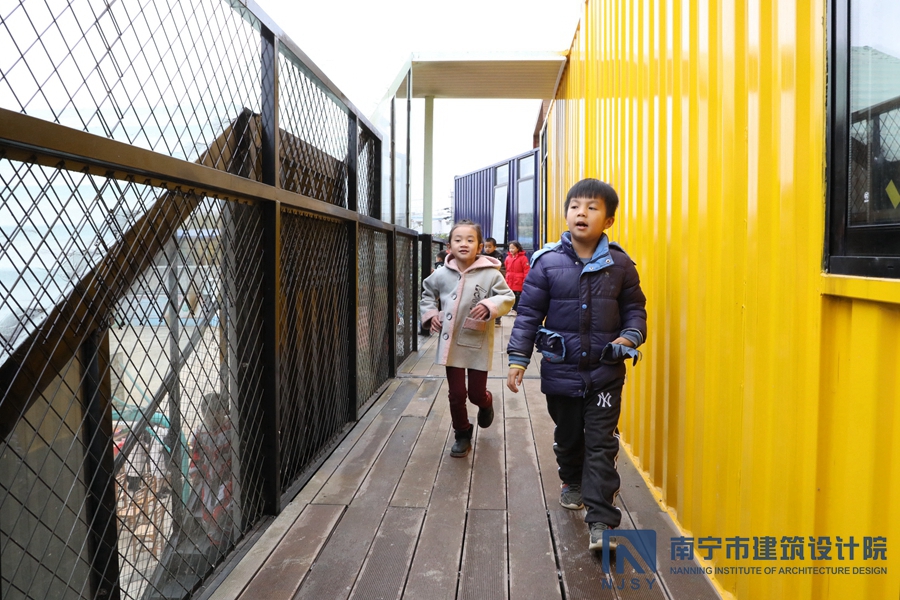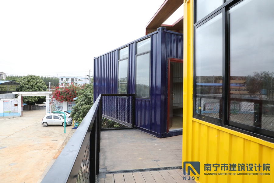 項目采用了集裝箱房屋的形式,由10個集裝箱構成,通過堆積木的形式,根據學生兒童所需的建筑風格和功能需求,將集裝箱橫豎排列,形成一定的退臺和露臺空間,為孩子們提供更多共享活動空間。